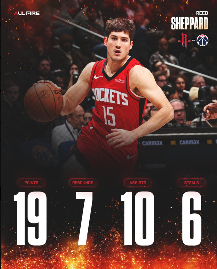 此役后谢泼德最近四场比赛,场均35.2分钟,拿到20.3分5.3助攻4.5篮板2.5抢断1.3盖帽,三分命中率44.4%,他本赛季先发的9场比赛火箭7胜2负。