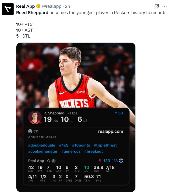 6.谢泼德是火箭队史最年轻的10+10+5抢断的球员。
